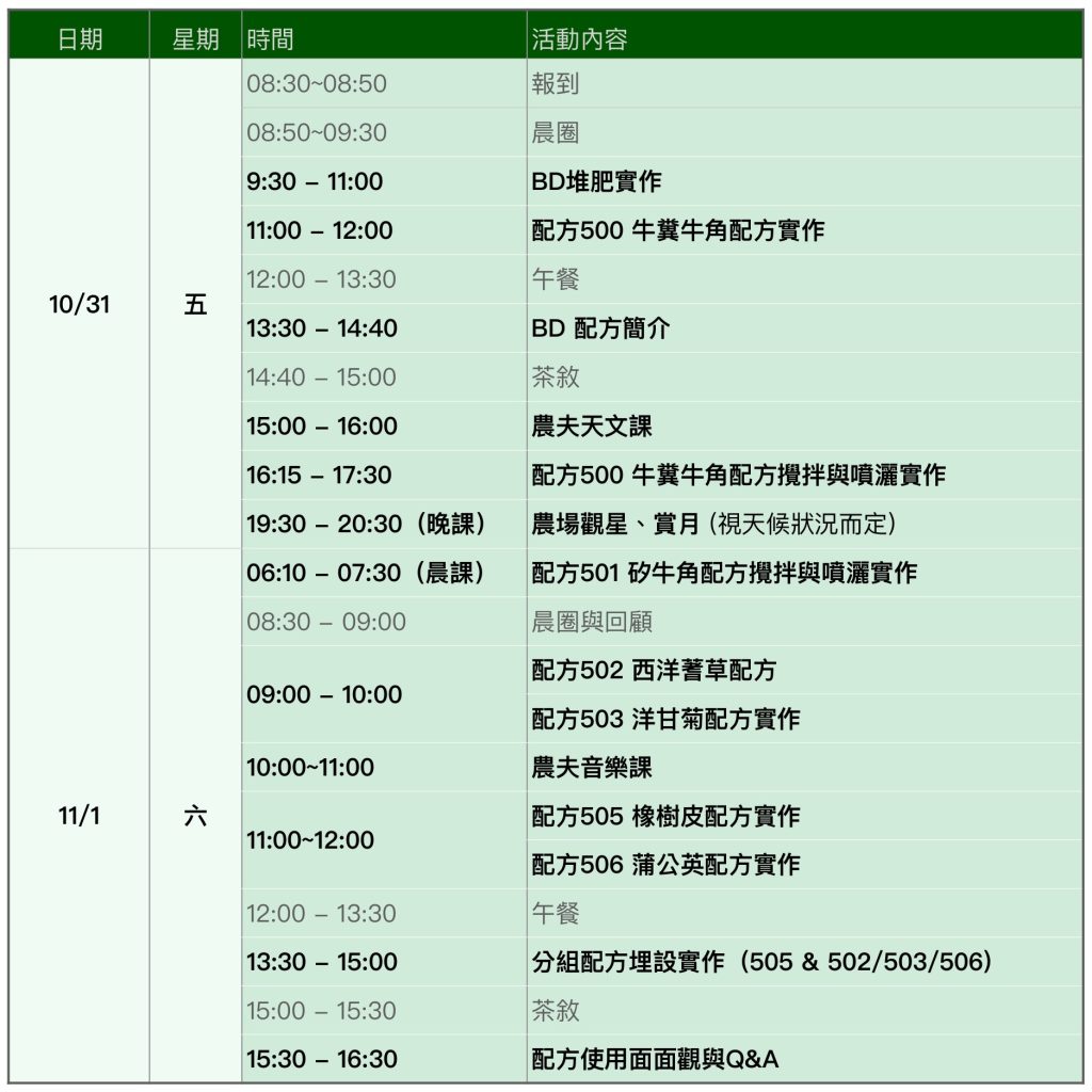 本次工作坊將以BD農夫實作配方為主軸,在兩天的課程中帶領大家實作堆肥;牛糞牛角配方(500) ;製作堆肥配方:-西洋蓍草(502)、洋甘菊(503)、橡樹皮(505)、蒲公英(506);攪拌及噴灑使用(500、501)配方,並討論宇宙的韻律與農耕的關係,理解農耕天文曆的應用。